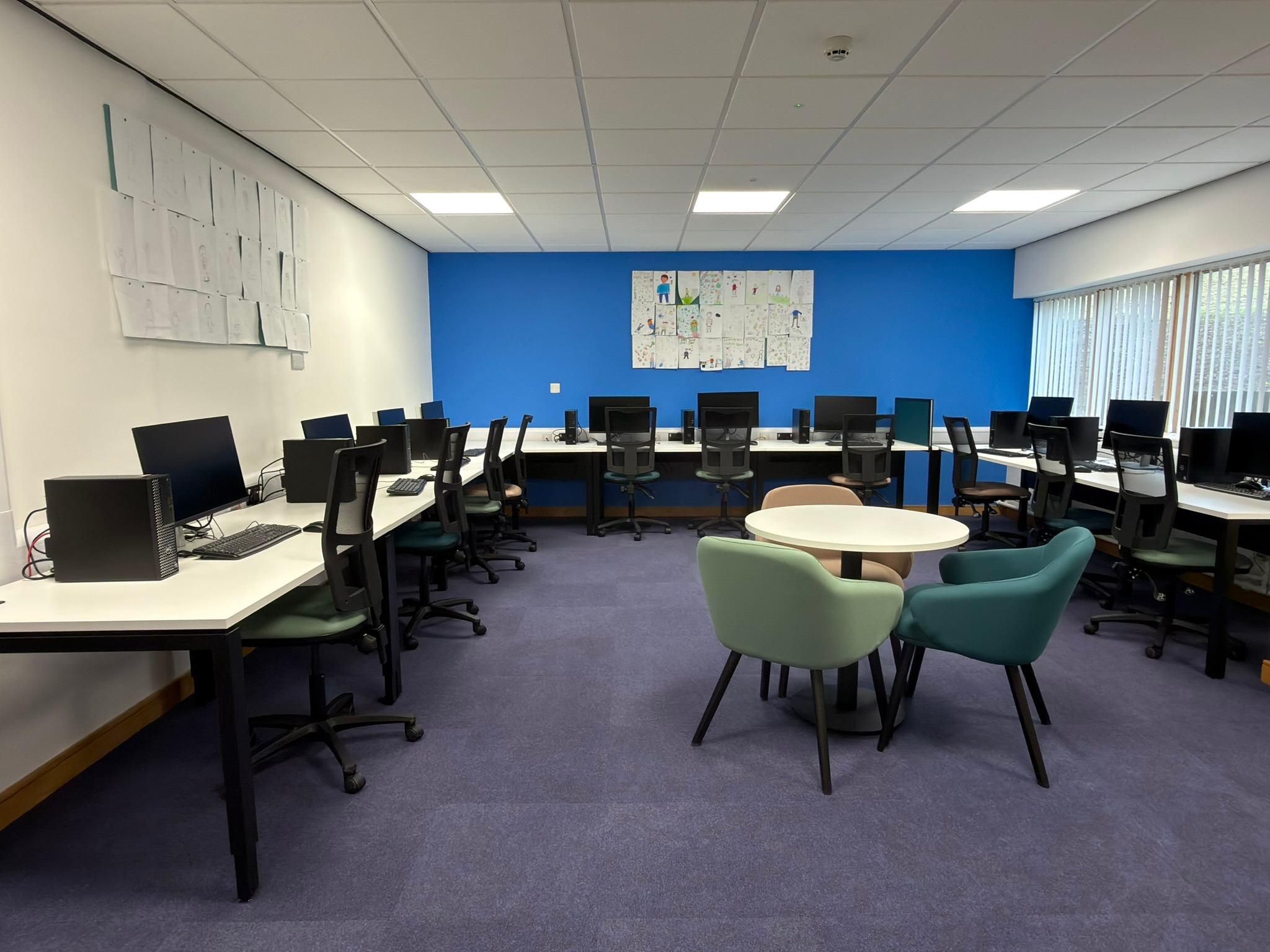 To give the space a sense of place, we specified light, textured wood‑grain finishes, complemented by vibrant accent colours that subtly reference Aberaeron’s iconic pastel seafront houses. The result is a calming palette with uplifting touches that encourage exploration and comfort.