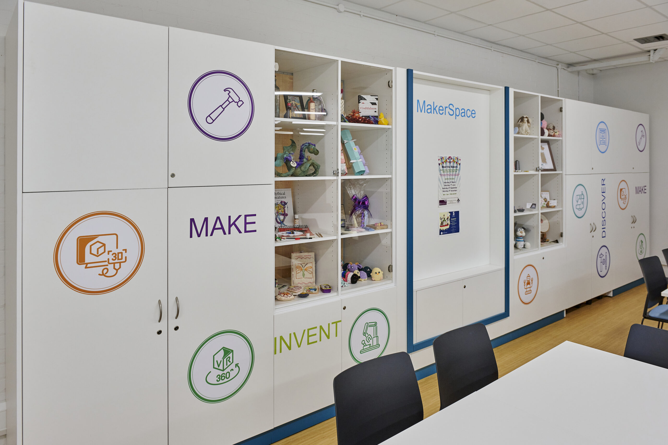 - Other ground floor features include a flexible Makerspace, a mini theatre area for events, and the Oasis Soft Team Pod to support wellbeing and quiet study. The first floor expands on digital access and flexible working, with integrated power, soft seating, and a standout StudyWall. A Business Lounge provides a semi-private space for solo or group work.