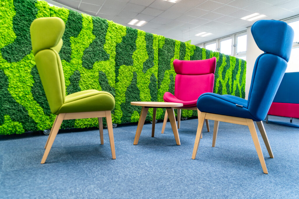 Dedicated IT areas have been integrated with future-proofed power modules, ensuring the space is equipped for modern digital use. A series of comfortable booths offer areas for private study or informal meetings, while more relaxed seating zones encourage reading and social interaction. Larger, adaptable tables allow the space to transition easily to support events and group activities. Living moss wall panels have been incorporated throughout, introducing a natural element that enhances wellbeing while helping to improve air quality.