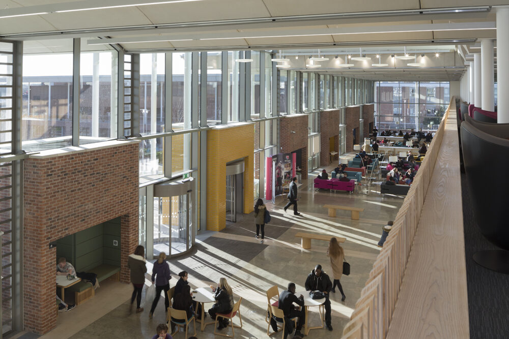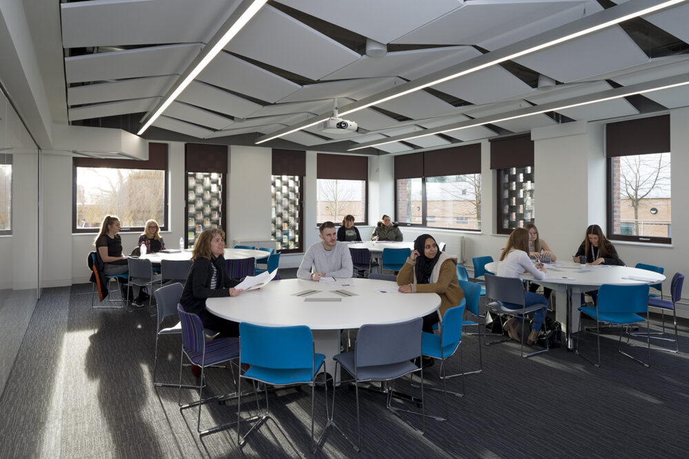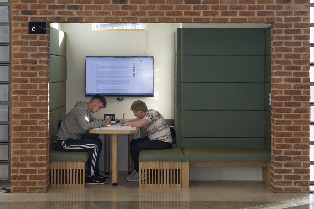 A number of collaborative spaces fully equipped with audio visual equipment to facilitate group study by way of 9 purpose built pods were manufactured and installed by Frem Group. The colour ways of the pods’ upholstery using Kvadrat Steelcut were chosen to complement the construction materials of the new buildings, in particular the glazed brickwork to the Pavilion pods and timber acoustic balustrading.